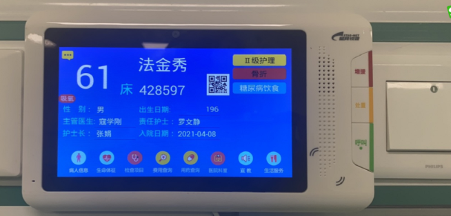 入住科室的第一天,護士會對患者進行“入院宣教”,除了正常的住院注意事項外,還專門指導患者學會了病床上方患者端的“ 智能電子床頭屏”,它是患者住院期間的信息小助手,通過它不僅可以查詢患者的體征數據、護理事項、住院費用、檢查項目預約情況、住院及治療須知等豐富信息,還可以提供點餐、醫(yī)療服務評價等服務。